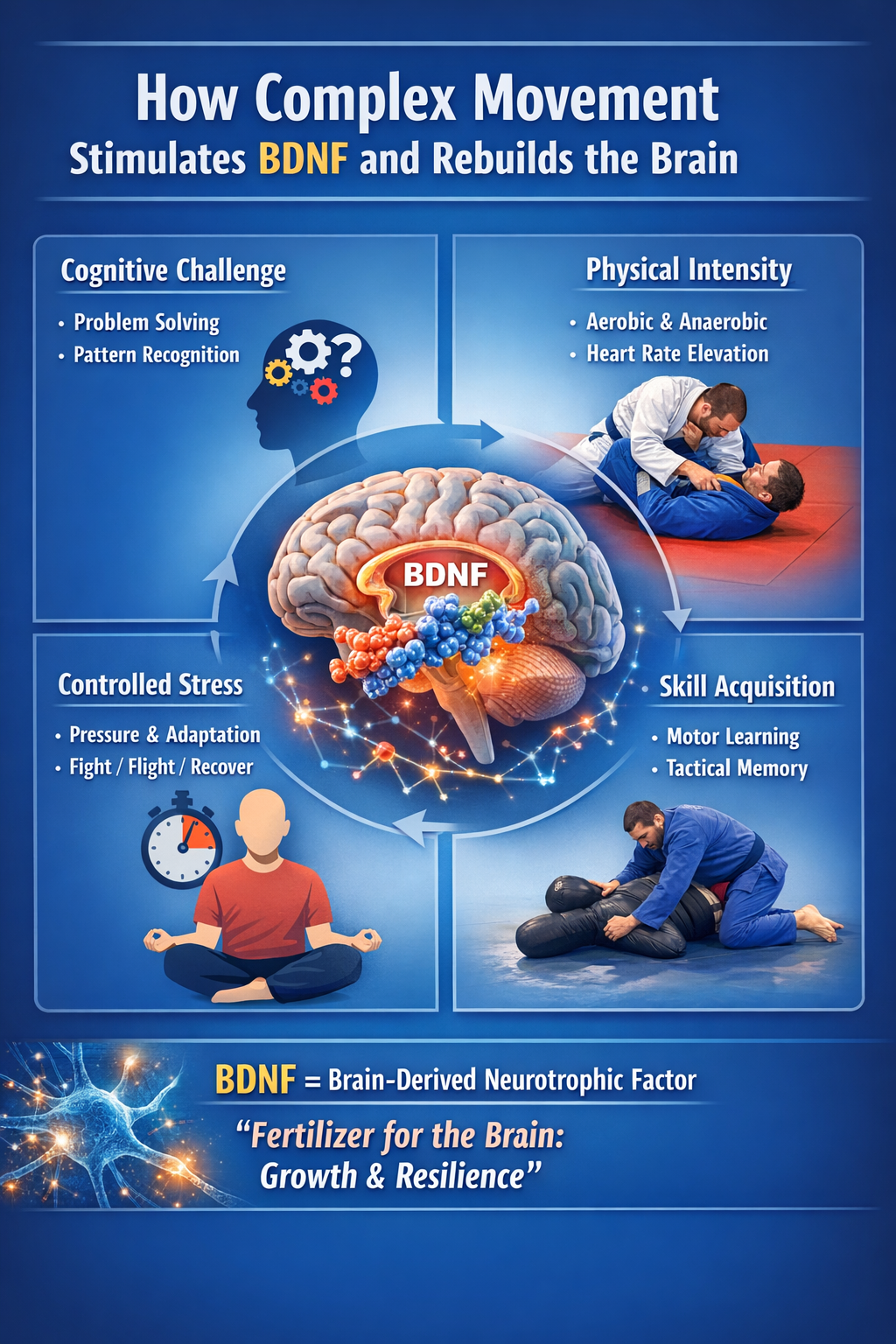 Brazilian Jiu-Jitsu is often described as physical chess. That description is more neurologically accurate than poetic. During a live roll — a training match — the heart rate enters moderate-to-high intensity zones sufficient to drive aerobic BDNF signaling. Simultaneously, the brain is required to process three-dimensional spatial orientation, anticipate an opponent's intent from subtle kinesthetic cues, retrieve and sequence technical movement patterns under time pressure, regulate fear and frustration, and make rapid tactical decisions when conditions change.